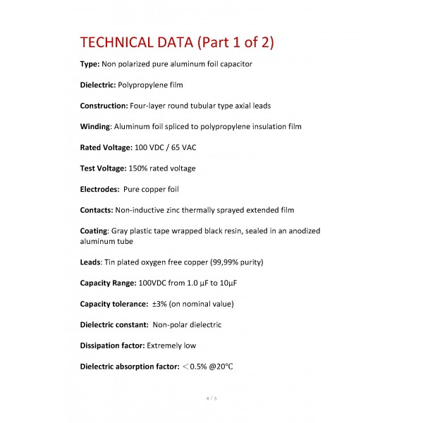| Type: | Non polarized pure aluminum foil capacitor |